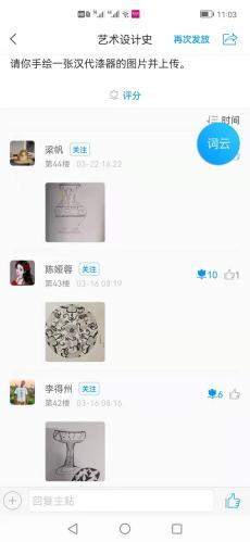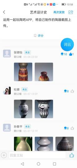 课前环节。我主要借助于超星学银在线的课程教学视频,课前让学生完成视频观看,对经典设计作品进行审美感知和初步审美鉴赏,讨论并上传学习通,对学生的审美鉴赏进行评价打分。同时,以任务驱动的方式,每个小组分配不同的课中讨论问题并准备课件;介绍与课程内容有关的虚拟仿真实验和相关APP,让学生利用虚拟仿真实验沉浸式地体验传统工艺流程;推荐玩陶吧APP小程序等,让学生自己烧制个性化陶瓷器,激发学生学习兴趣,为有效课堂教学做充分的准备。