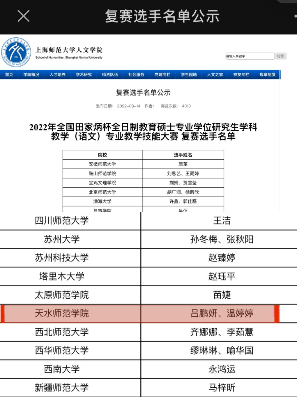 8月中旬,大赛筹备委员会公布了入围决赛的名单。据悉,全国共有115所高校(包括六所部属师范院校在内)参与,参加初赛的选手455人,进入决赛的153人,我院有2名研究生入围决赛。