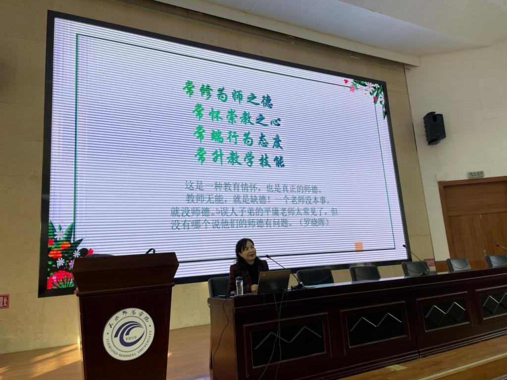1月5日下午和晚上,甘肃省特级教师、中学正高级教师、天水市逸夫实验中学副校长马佩霞作了题为“明明白白学做语文教师”的专题讲座。马佩霞老师从“有业”“敬业”“乐业”三个方面阐述了教师的意义和价值,传授了自己学做语文老师的经验,为广大师范学生从教提供了行动指南。