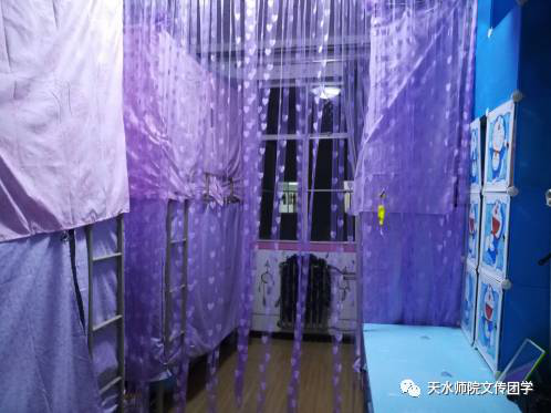 梦幻仙境。这小小的宿舍的装扮也费了大家不少的心思,虽然它又小又破,但是花点心思装扮也是很美丽的。紫色的丝带,紫色的床帘都散发着凉爽的夏意。生锈的暖气片上也被包上了美丽的紫罗兰花。这的确是大家的家!美丽而温馨。